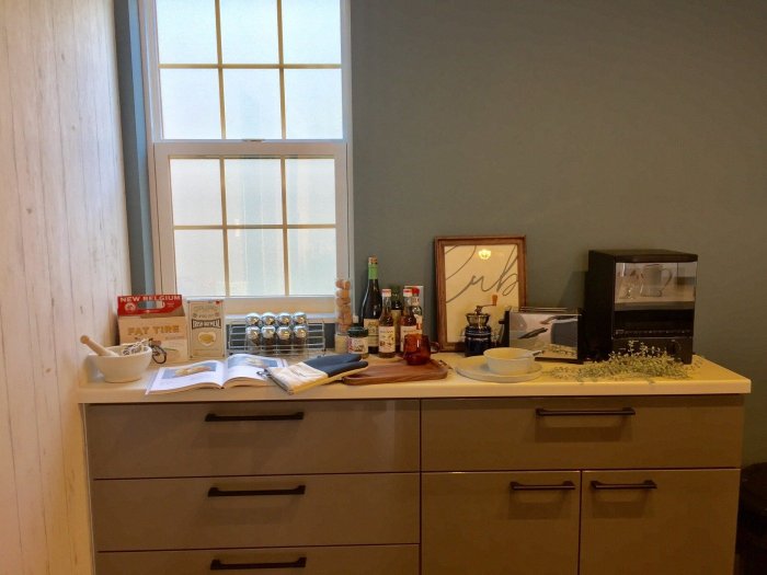1スペースに3色くらいで収めると、ごちゃごちゃした感じがでないので、置くもののトーンや色を絞って置いてみてくださいね。