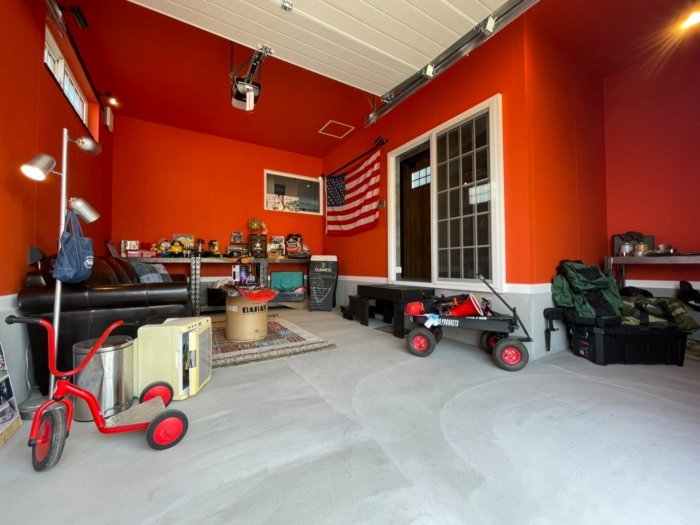 アメカジのガレージは車入れるだけではなく、写真のようにソファや棚を置いて