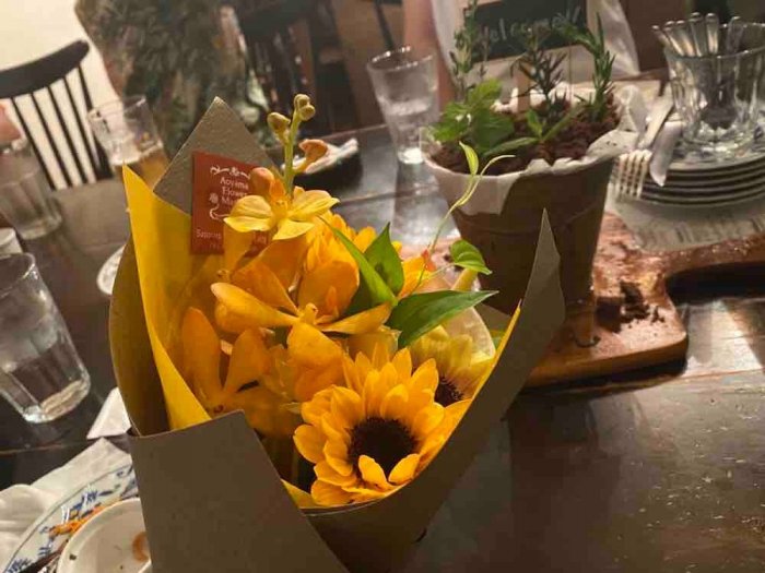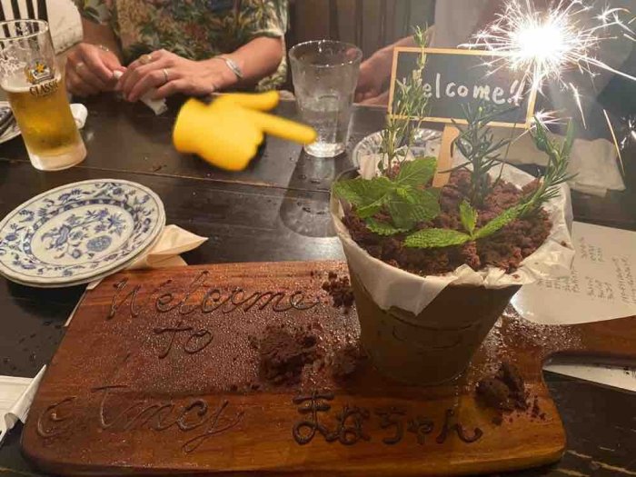 この写真は歓迎会の時にアメカジメンバーにサプライズでケーキと花束をもらったときのものです。