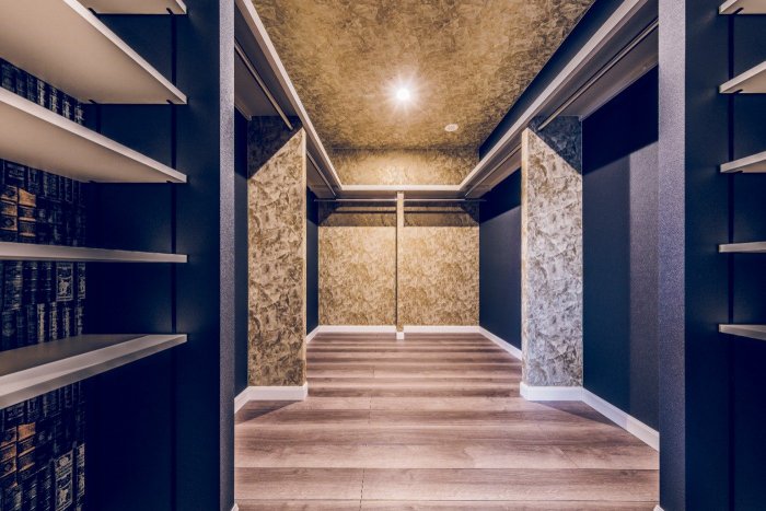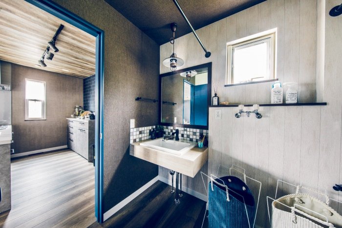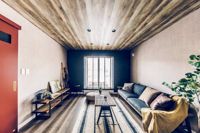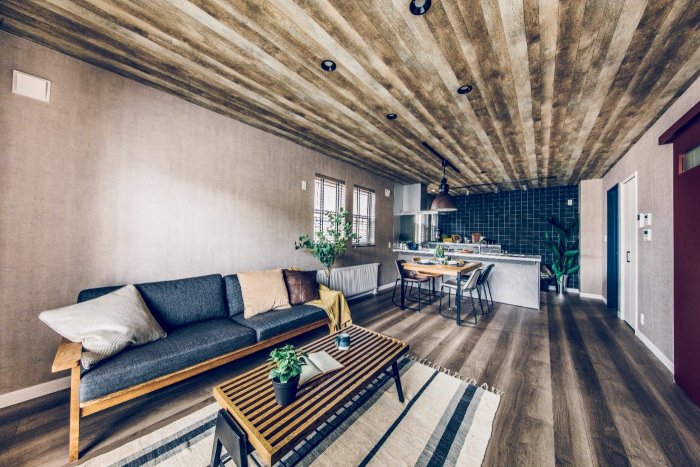 LDKのクロスは木目の天井にグレーの食器棚の後ろのブラックのタイル調が映えてめちゃくちゃかっこいい✨