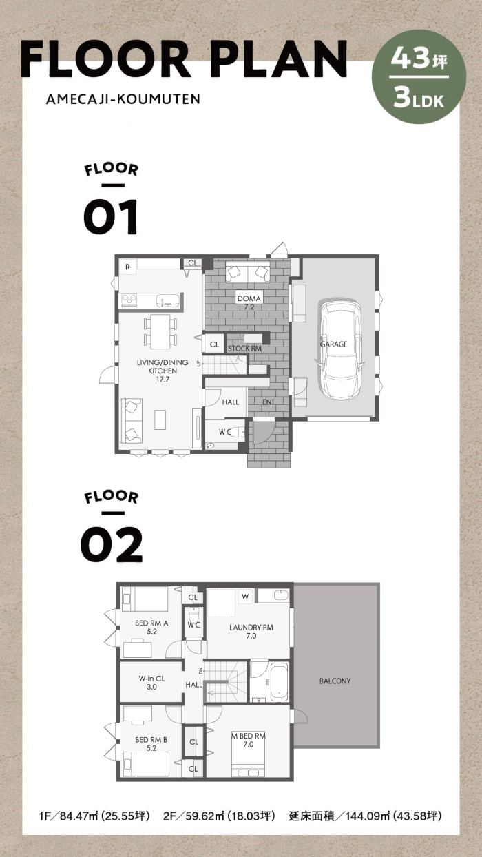 ビルトインガレージや土間スペース、インドアサウナ&プライベートバルコニーが大変好評な間取りです。