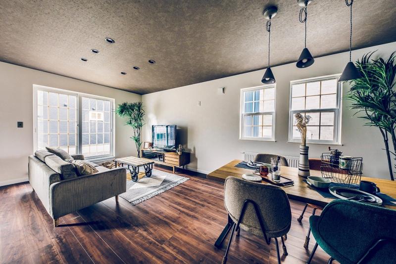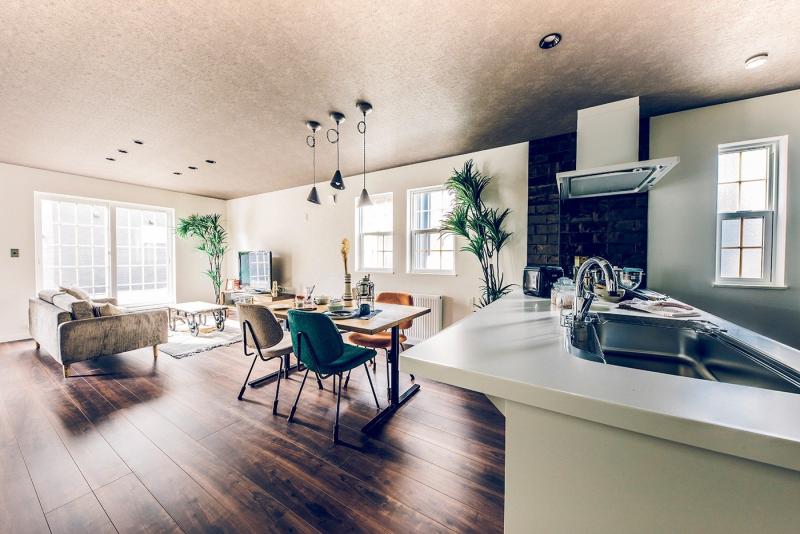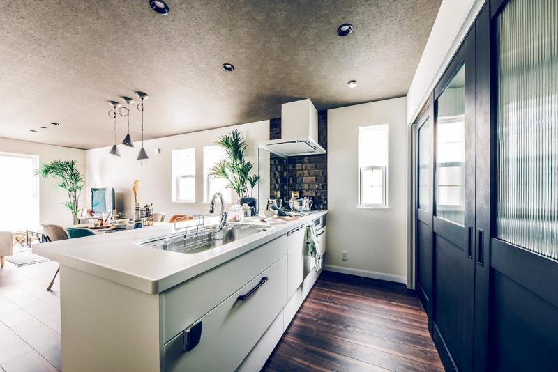 趣味の拠点や仲間との遊び場として使える、全面オレンジのガレージ。 アイアンの室内窓やキッチン背面の引き違い戸が映えるシンプルビンテージな空間。 洗濯物干しはもちろん、おうちアウトドアにも使えるバルコニー。 造作カウンターとコレクション用の棚を付けたテレワーク対応の書斎スペース。