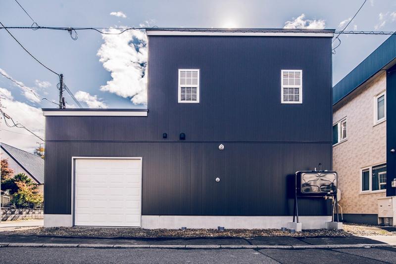 白×グレーにアイアンの黒が映える、シンプルビンテージなガレージハウス