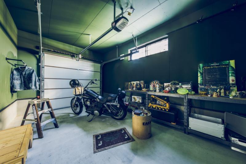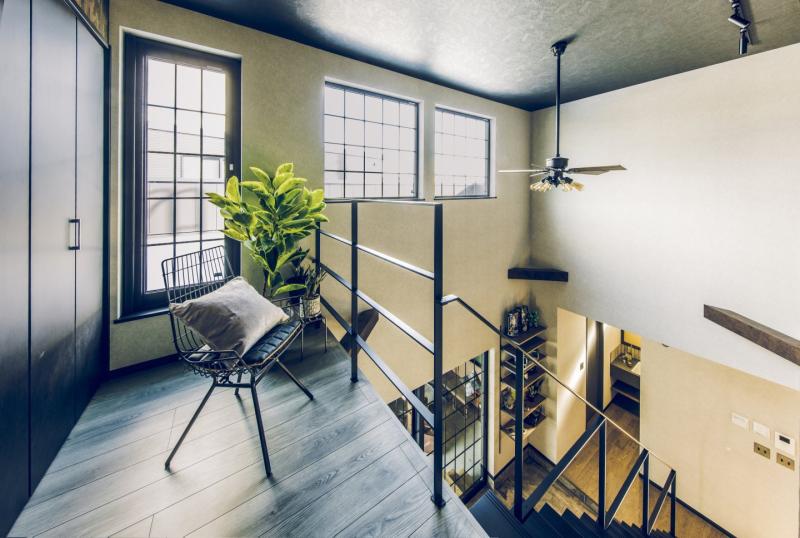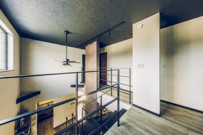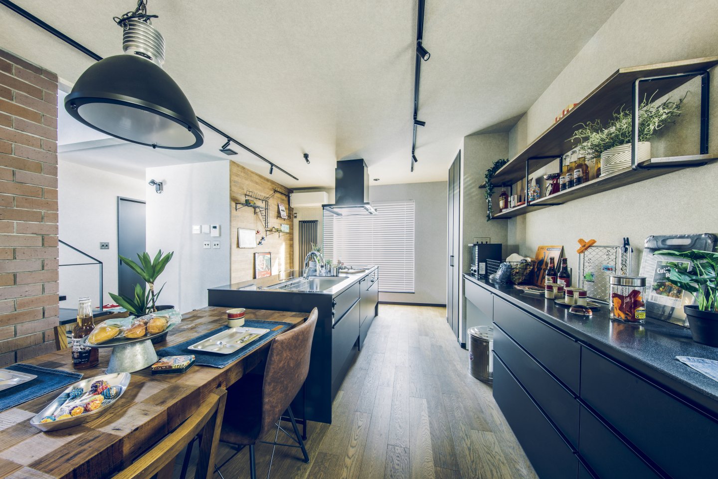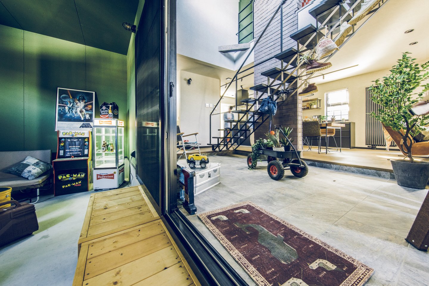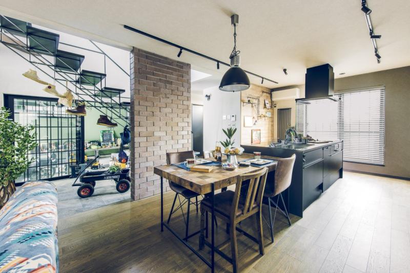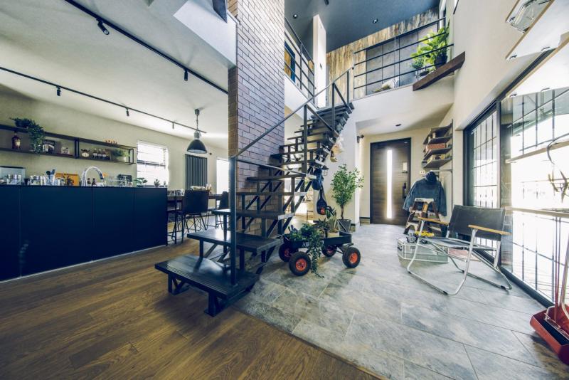ガレージ、土間、リビングが一直線につながっ開放的な間取りは趣味を楽しんだり仲間と集まるのにぴったり。本物のレンガやアイアン、木目と異素材を組み合わせたヴィンテージデザインが落ち着いた室内空間を演出します。