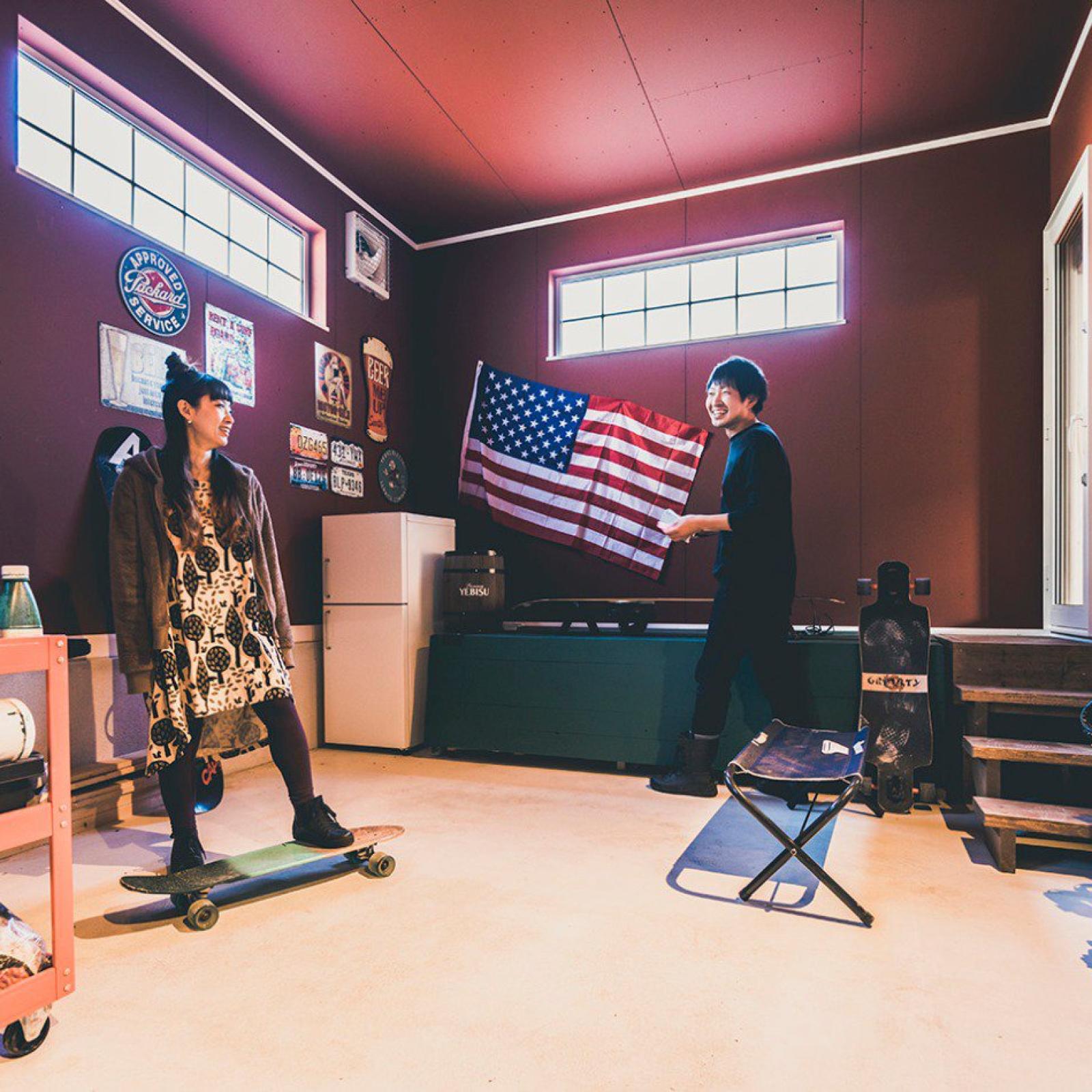 夫婦でスノーボードをやるので、山の近くに住みたい!と。ここなら、雪が降ったらすぐに滑りにいけるので嬉しいですね。友人が遊びにくることが多いので、リビングダイニングは広めにして、キッチンもカウンターで開放的に。車のためではなく、スノーボードやスケボーを楽しむためのガレージが欲しかったんです。あと冬でもBBQができる場所も!西海岸風のインテリアを目指して、コーディネートを楽しみました。