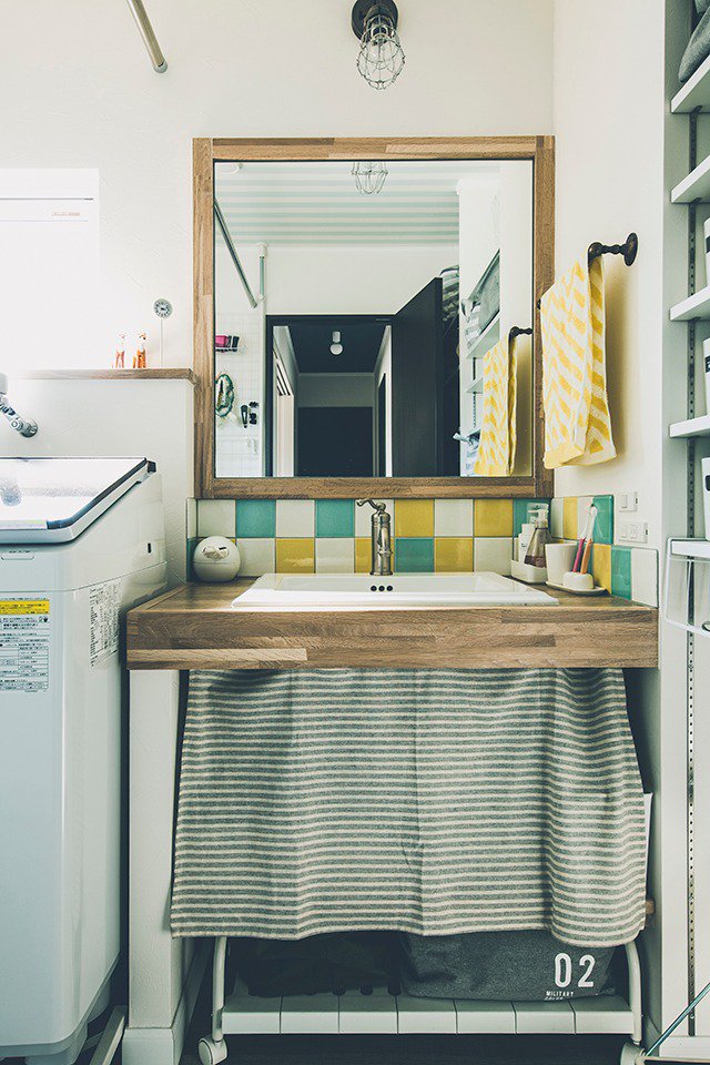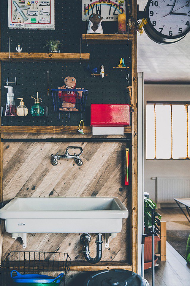 とにかく土間を広くとりたくて。結果、お風呂が2階に(笑)。リビングは食事、土間はくつろいだりする場だったりもします。土間が床暖だから、山から帰ってきて濡れた道具を置いておけば乾くし、大きめシンクの手洗いもつけたので、キャンプ道具もすぐ洗えてラクですね。ラックとかボードのメンテ台とか、いろいろDIYもしています。アイデアは妻、つくるのは僕って感じで。