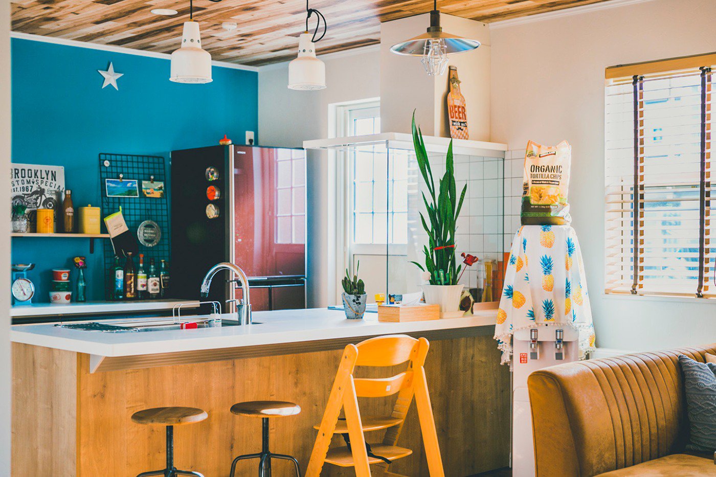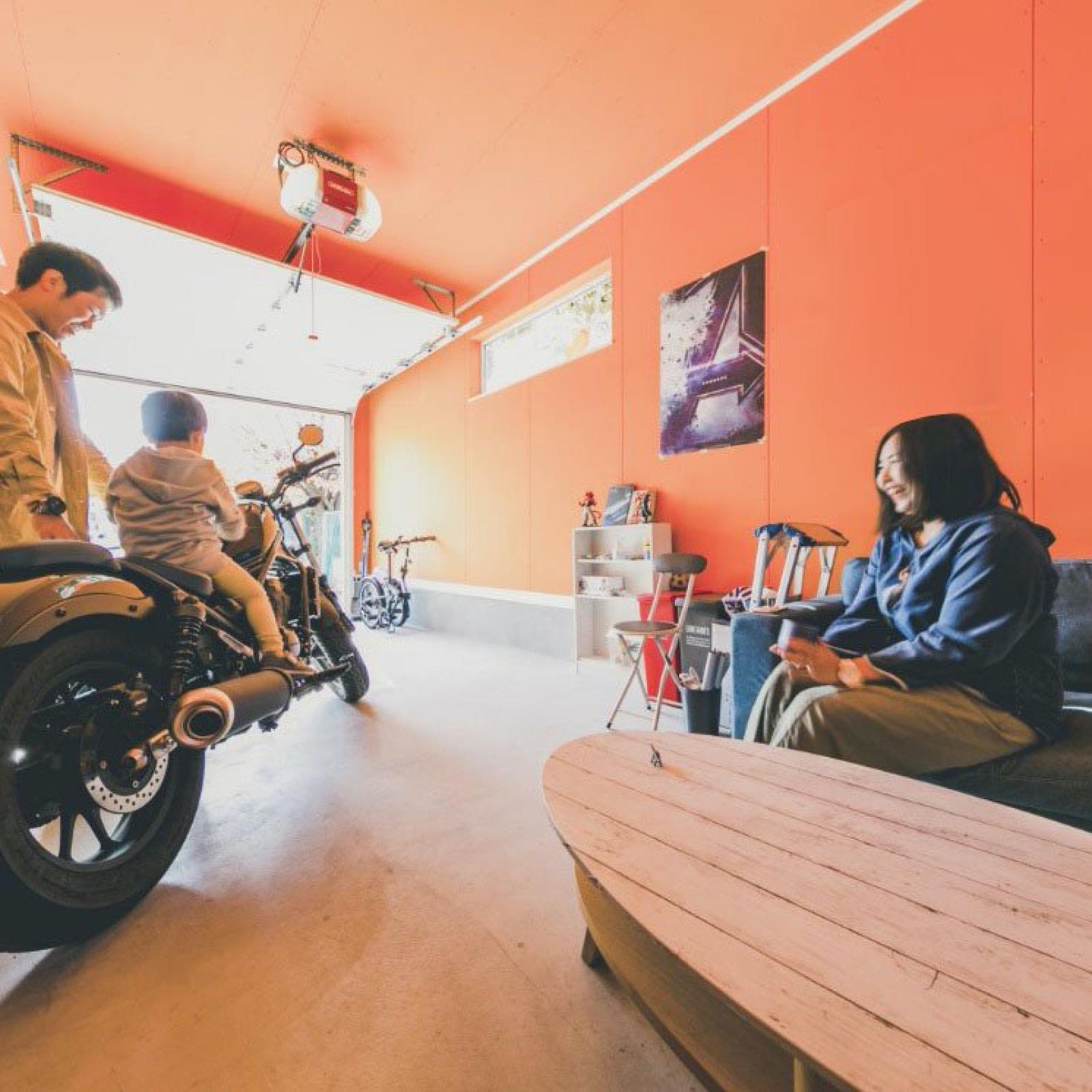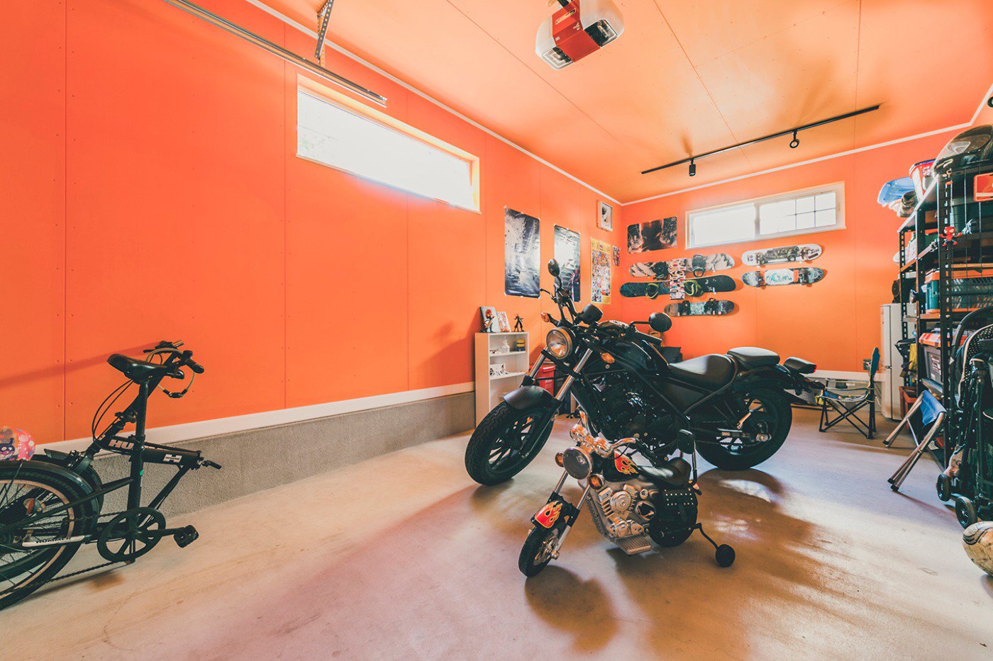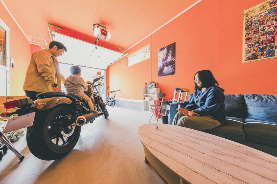 探してくれたここの土地は、ほぼ即決でした。たくさんわがままをいったんですけど、それが叶った感じです。家の中は妻の好みに。ターコイズブルーのクロスは絶対に使いたかったと。やりたいことを全部取り入れられたといっています。ガレージは自分の思うようにつくっています。車庫というより、好きなものを置いて部屋のようにして空間自体を楽しみたくて。建てたあとに買ったバイクも置いています。妻もバイクの免許を取りました。