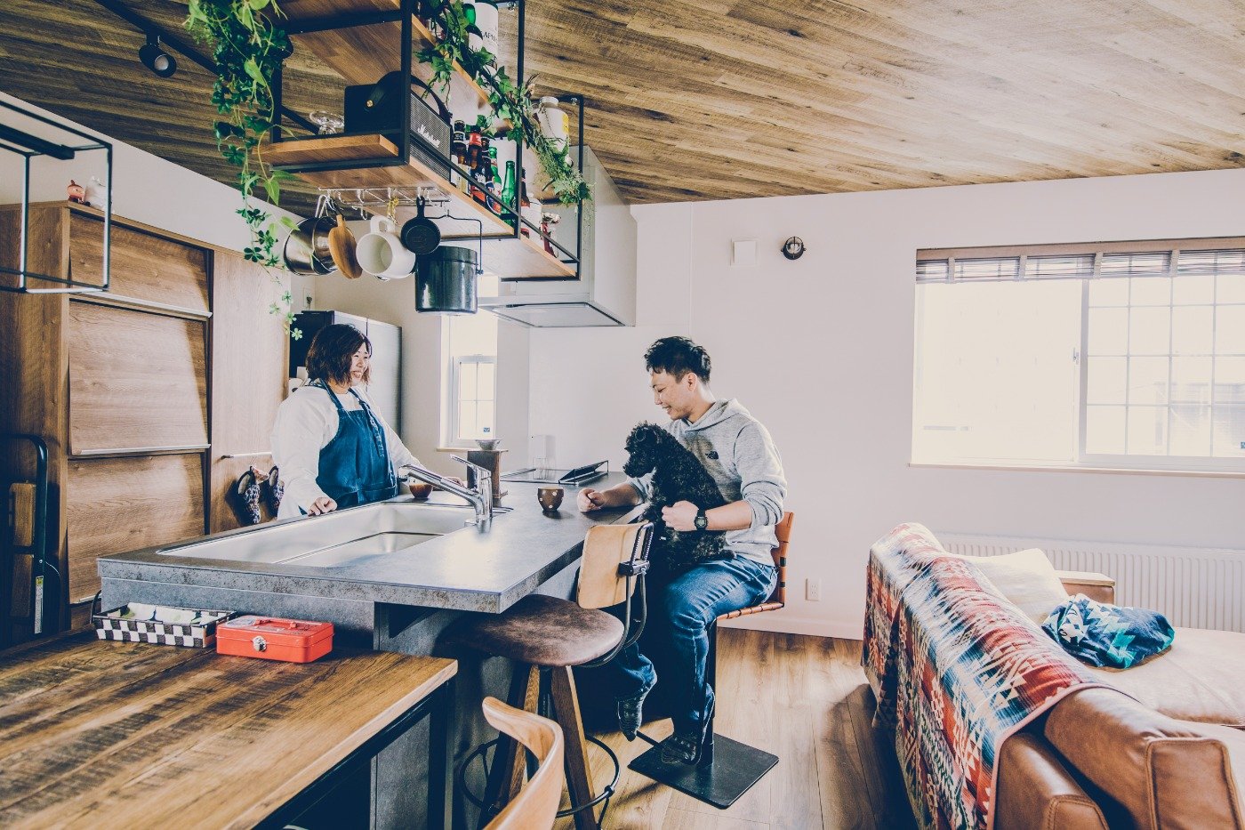 たまたま僕がインスタで見て、アメカジ工務店を知りました。妻は犬を連れて一人でもデイキャンプするようなアウトドア好き。誘って一緒にオープンハウスに行ってみました。妻はアメカジの家の間取りとか雰囲気とか、ほかで見た決まりきった感じとは違うところに惹かれたようで。僕はガレージですね。ガレージがかっこよくて、コレだ!建てるのはアメカジの家だって、その場で決めた感じです。