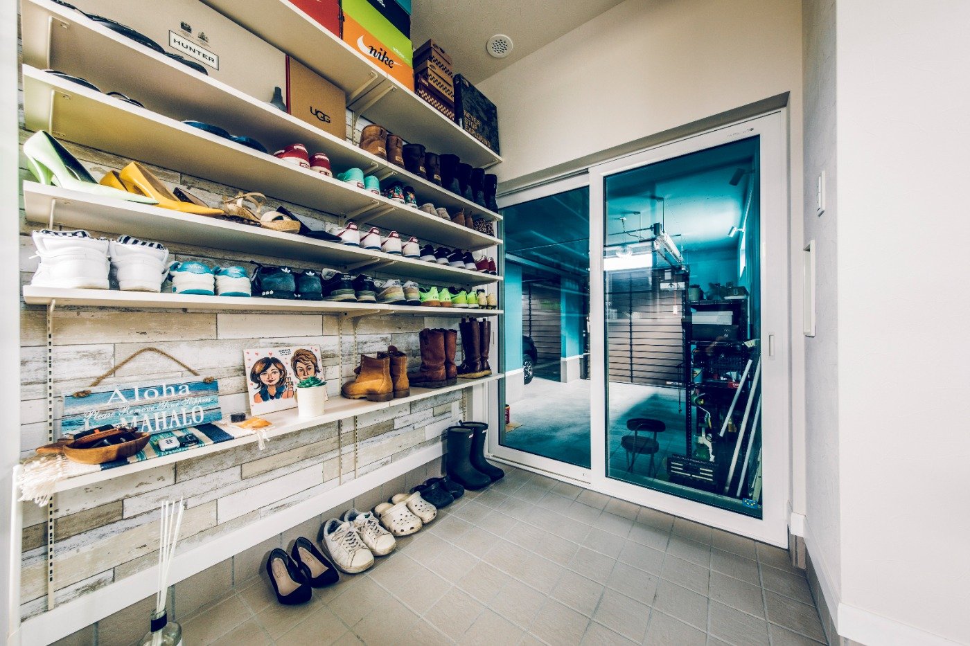 玄関土間のガラス扉もガレージが見えて開放的で気に入っています。インテリアは白を基調にマリンな雰囲気にしました。アクセントで水色を入れて、デニムのクロスもお気に入りです。主人はもっとカラフルにしたかったみたいですが笑。リビングでのんびりと音楽を聞いたり、ゲームをしたり、映画を見たり。明るくて、気持ちいい家になりました。