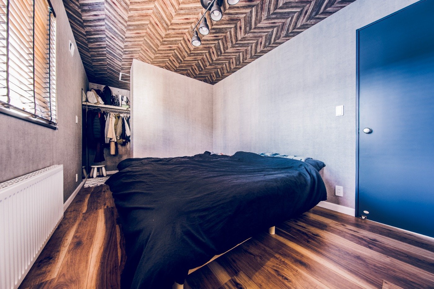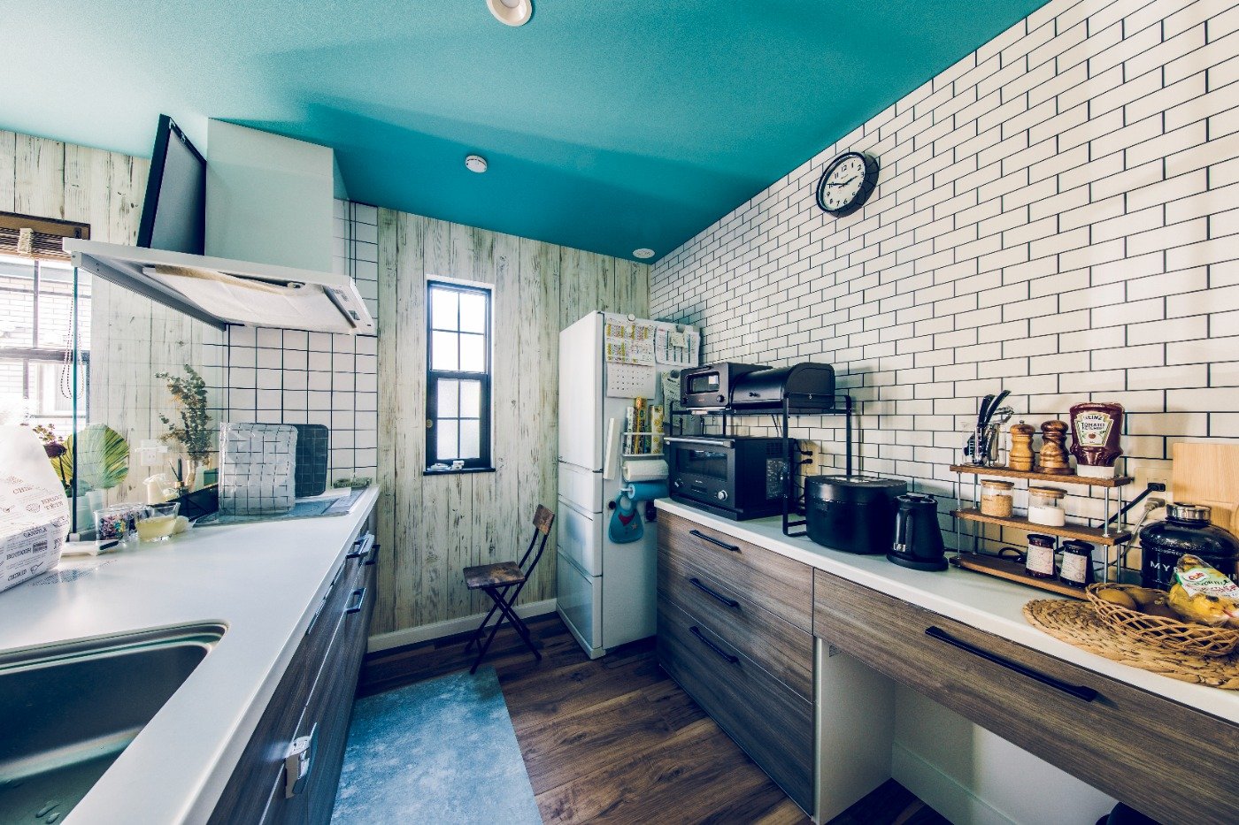 金利や住宅ローン、土地探しなど、家づくりに関することはYouTubeで夜遅くまで勉強しました。毎日寝不足になるくらい、夢中になってましたね。土地は毎日ネットで探して、今の場所を見つけて。担当の方にも見てもらい、サイドガレージが建てられるし、日当たりも良い。70坪の広さがある、この土地に住むことを決心しました。間取りは子ども達がいずれ巣立っても、ふたりで暮らしやすいよう1階を充実。リビングや水回りはすべて1階にして、リビングの他に部屋をひとつ設けました。今は子ども達の遊び場ですが、いずれは自分たちの寝室になる予定。賃貸の時は収納がなくて不便だったから、収納スペースをたくさん確保したかな。基本は極力モノを増やさずスッキリ暮らしたいけど、お互いに服が大好きだから、ウォークインクローゼットやシューズクローゼットは広めに作ってもらいました。家づくりをする前から、外観は絶対黒いガルバに、ガレージの中はオレンジにしようと決めていて。内装は妻の強い意向でマリンテイストに。クロスで空間を遊べるのが楽しかったですね。”唯一無二の家にしたい”って何回も言ってたな笑。自分たちがカッコいいと思うモノがいちばんカッコいいと思ってるから、信念を持って家づくりをしましたね。だからあまり迷うことなく、お互いに好きなモノを選んで今の家が完成しました。