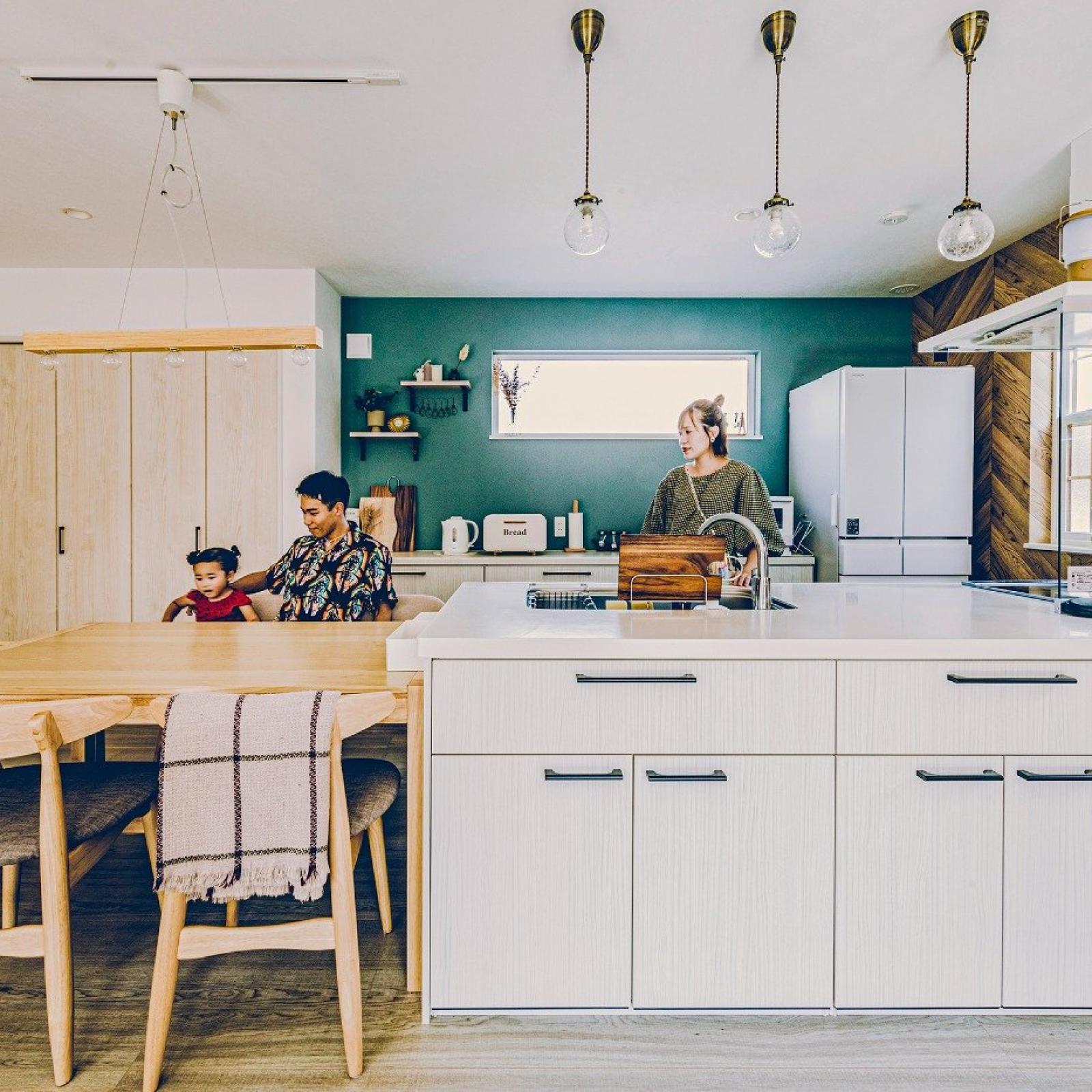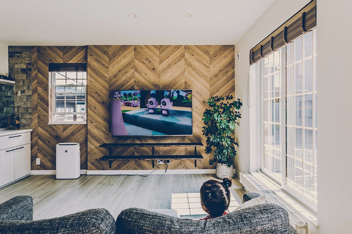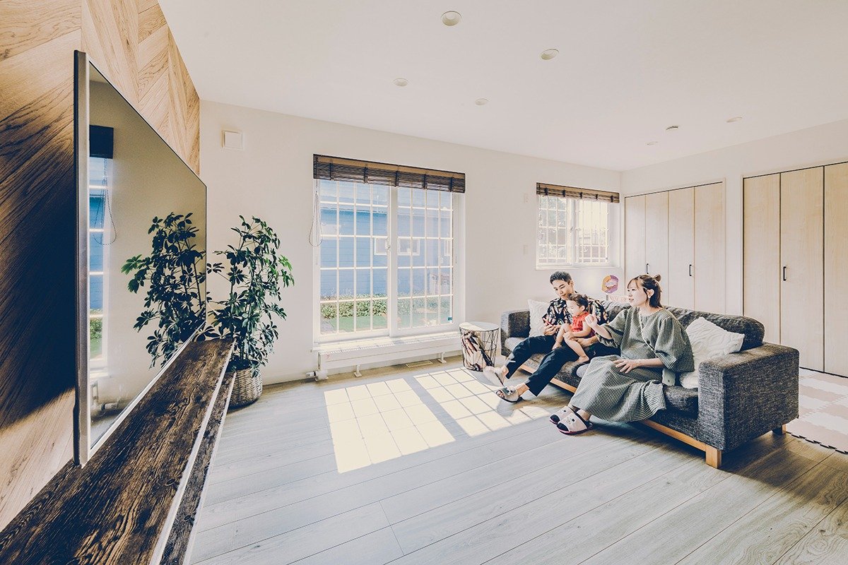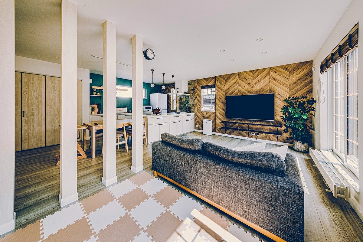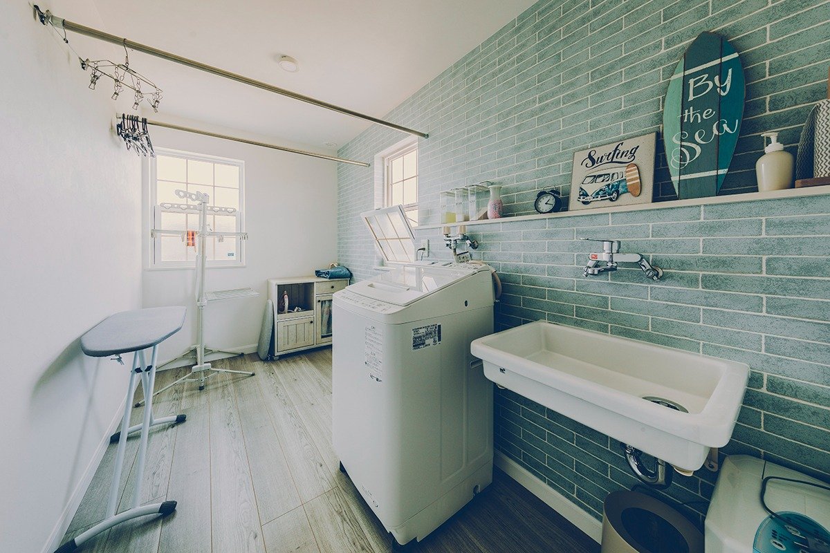 アメカジ工務店の魅力は、照明・カーテン・壁紙などが豊富に選べて、自由度が高い家を造れること。ヘリンボーン柄やブルーの壁紙で、リビングにはサーファーズハウスの雰囲気を取り入れました。念願だった壁掛けTVも実現できて、嬉しいですね。妻は、洗濯物を干したユーティリティスペースに来客を通すのが嫌で、専用の部屋が欲しいと言っていて。2階につくったランドリールームは機能的で使い勝手が良いです。休日は趣味のサーフィンはもちろん、自宅で洗車したり、DIYができるのがいいですね。最近は、庭に人工芝をひいたり、フェンスを建てたり、自分で手をかけるのが楽しみ。このペースで徐々に外構を整備したりしていきたいです。インドア派だった妻がキャンプにハマったので、家族でアウトドアも楽しみたいですね。ジョンソンホームズは、ワークショップが毎月開催されているので、DIYやインテリアのライフスタイル倶楽部にも参加してみたいな。この家に住んでから、インテリアにも興味を持つようになったんです。妻はクリスマスに向けて、リースづくりをしたいと意気込んでいます♩
