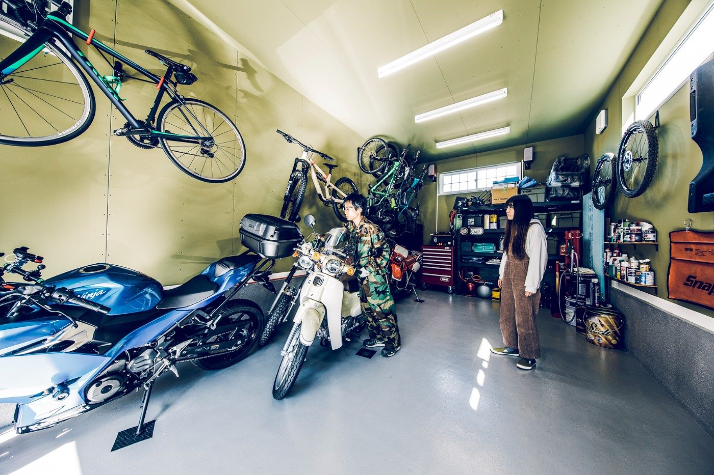 前に住んでいたのは、ガレージ付きの賃貸アパート。車2台・バイク3台・自転車2台を置くには狭いし、何より車の出し入れをするのが大変でした。僕がひとり暮らしをしていたアパートだったから、結婚してふたりで住むには、部屋も水まわりも手狭でしたしね。それに、うさぎの影響も大きいかな。ペット可の物件じゃなかったから、妻が実家で飼っていたうさぎと一緒に暮らせなくて。家づくりを本格的に考え始めたのは、ガレージの中で自転車が倒れて、愛車にキズが付いてしまった時ですね。たまたまアメカジ工務店のチラシが家に入って「こんなガレージハウスに住みたい!」とすぐに有休を取って、ひとりでモデルハウスの見学に行きました。実物のガレージは最高にカッコいいし、カーキの室内ドアやグリーンの外壁など、緑色が好きな僕にハマる家だったんです。後日、妻も連れて、いくつかのオープンハウスを案内してもらったら、広いUTスペースや内装のデザインを気に入ってくれました。他社も比較しようと、総合展示場にも行ったけど、予算もテイストも合わなかったですね。話を聞いた営業マンも、ゴリ押しな感じで、ちょっと違うかなと。僕のアメカジ工務店への決め手は、やっぱりガレージ。車やバイクをただ置くだけじゃない、遊びのある空間に惹かれました。妻は当初、家を建てるのを不安がっていたんです。でも、アメカジのスタッフの皆さんは話しやすく親切で、この会社となら一緒に家づくりがしたいと言うように。おかげで終始、打ち合わせが楽しかったです。住宅ローンや土地探しなど、しっかりサポートしてくれたから、最後まで安心して進めることができました。