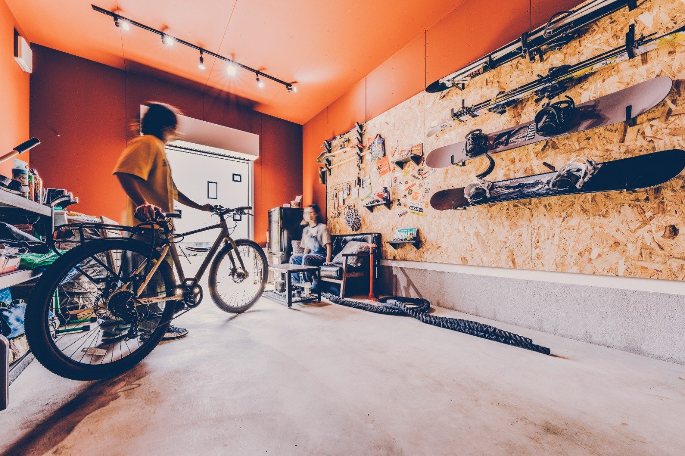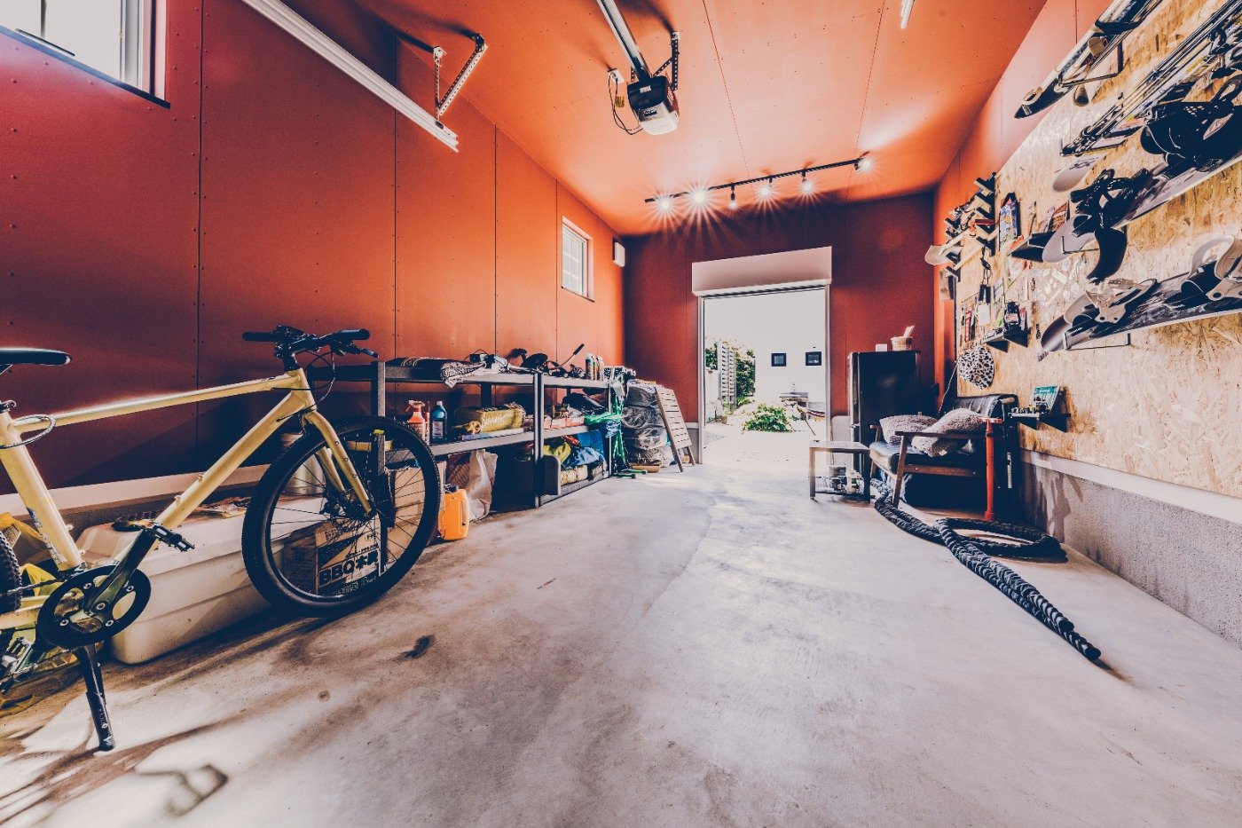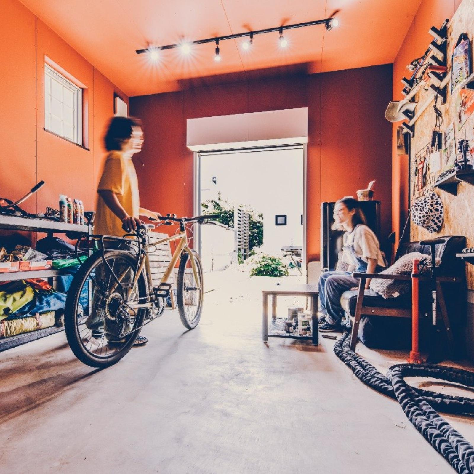 おうちのこだわりは、やっぱりガレージですね。ソファとテーブルを置いて、妻や友人とくつろいだり、スノーボードや自転車の手入れをしたり。時にはガレージで、筋トレもしますよ笑。スノーボードウェアも掛けられる大きな土間や、倉庫をイメージしたリビングのクロスも気に入っています。住み始めて約1年半が経ちますが、めちゃくちゃ最高です〜!思い返すと、前の賃貸は、このガレージくらい狭かったかも笑。狭い家に何人も遊びに来てくれていたけど、今は家も広くなって、念願だったガレージも造れて。友人もお互いの家族も、気軽に集える環境になりました。友人に「雨の時はガレージでBBQしないの?」と聞かれるんですが、ホットプレートでギリギリセーフ笑。大切な場所だからこそ、綺麗な状態を維持し続けたいです。